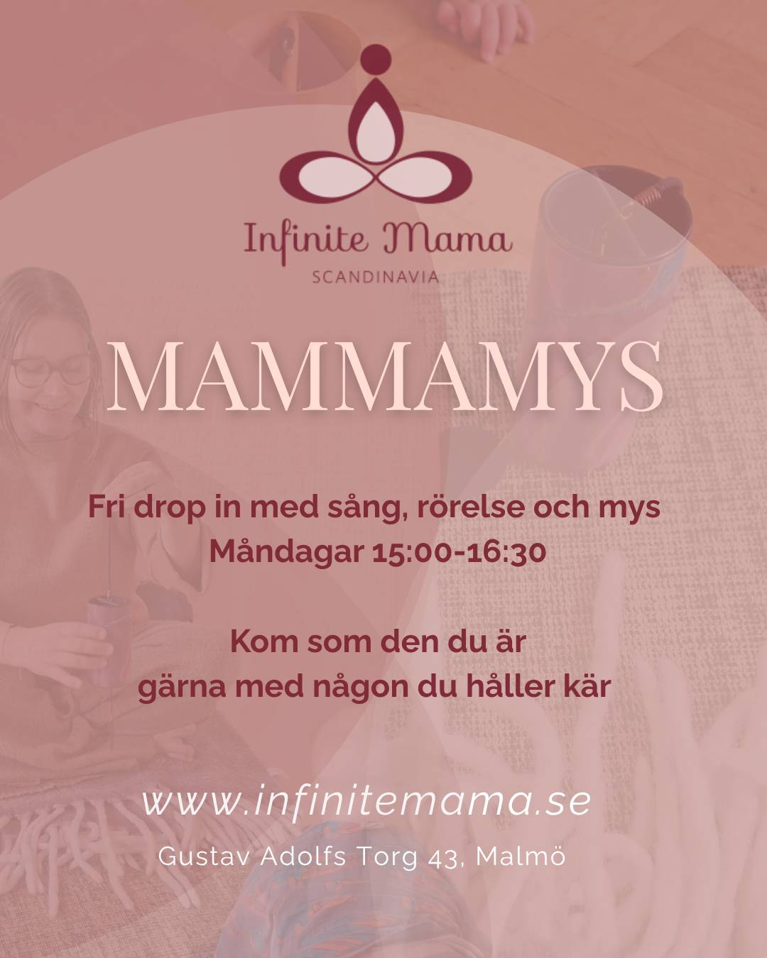 Varmt välkommen till en stund fylld av glada toner och mjuka rörelser tillsammans med ditt eller dina barn. Du är lika välkommen på egen hand. Vi bekantar oss med sångens kraft att knyta band och lugna nervsystem. Aktiviteten passar för alla åldrar från nyfödd till senior och anpassas efter dagens rytm och impulser. Kom precis som du är - allt annat finns på plats ❤️ Infinite Mama bjuder in till mammamys för dig som gått, är anmäld till, eller helt enkelt är nyfiken på vad som händer i studion och online. Mammamys-träffen är för mammor och gravida som vill möta andra mammor och vara en del av ett mjukt, kravlöst och vilsamt stärkande sammanhang. Barn i alla åldrar är varmt välkomna att vara med på träffen, men du är lika välkommen på egen hand. Vi bjuder på enklare fika, te, samtal och mjuka rörelser. Varmt välkommen precis som du är! Mammamyset har ett upplägg där det går helt fint att droppa in och ut så som livets rytm faller sig. Även äldre barn och syskon välkomna. Studion är öppen mellan 15-16.30 för oss att landa en stund tillsammans, kom och gå när det passar för dig ❤️ Praktisk info: Studion ligger på Gustav Adolfs torg 43, på andra våningen. Hiss finns, tre trappsteg upp till hissen. De flesta vagnar får plats men har du en extra stor modell så löser vi det tillsammans. Det finns även skötbord och omklädningsrum med dusch. Kom i mjuka kläder som du trivs i. Mattor, filtar, bolster och övrigt material finns på plats. Det ska bli så fint att dela denna stund tillsammans. Vi ses!