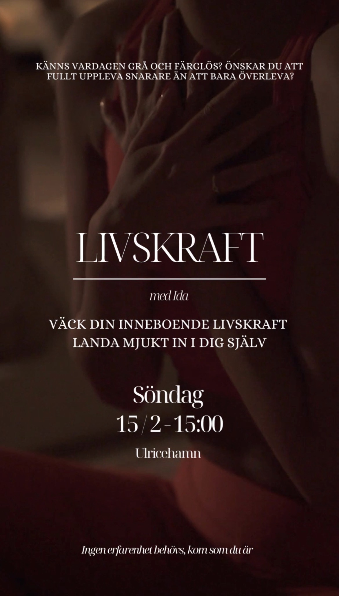 Varmt välkomnen till LIVSKRAFT med Ida! Ida kommer ifrån Ulricehamn men bor sedan några år tillbaka i Göteborg där hon också erbjuder klasser. Ida är äntligen tillbaka med en klass i Ulricehamn. 〰️ LIVSKRAFT 〰️ EN LIVSKRAFT (LFA) klass med Ida väcker mjukt din egna inneboende kraft som pågrund av dagens stress och livshändelser ofta inte flödar fritt. När kraften flödar igenom kroppen börjar blockeringar lösas upp och olika sensationer kan uppkomma. Allt från små till stora rörelser som startar från kroppen snarare än huvudet (tex ryck i ett finger till dans), känslomässiga förlösningar (så som gråt, skrik och skratt), ljus, visioner, djup meditation, känsla av värme, tyngd, bliss och kärlek. Allas upplevelser är unika och detta är helt normala sätt för kroppen och nervsystemet att frigöra stress som samlats under vår livstid. (Även vissa djur skakar för att bli av med stress). Allt är välkommet och en klass beskrivs ofta som en härlig, frigörande och innerlig upplevelse. När kroppen får leda och gammal blockeringar och stressenergi i nervsystemet släpper ökar kapaciteten att hantera livet flöde. Efter att gått på en klass känner många att intuitionen blir tydligare, de får lättare att sätta gränser, mer tillit till livet, mer acceptans, känsla av lätthet och lugn. Ökad energi, kreativitet, mer närvaro och kapacitet att klara av livets små och stora utmaningar. 💫 Vad händer under en klass? Deltagaren ligger ner på en matta och blundar under hela klassen medan hög musik, utvald för att skapa en unik ljudresa, spelas och facilitatorn går runt och rör lätt vid olika punkter på kroppen. Det enda deltagarna behöver göra är att slappna av, släpp taget och ta emot. Du behöver inte göra eller prestera något - var precis som du är. Klassen innehåller ett intro, guidad meditation, 60 minuter klass, guidad orientering och integration och delning. 📍H2 kontor, Nygatan 4, Ulricehamn 💫 Att tänka på innan klassen: • Ät gärna inte ett tungt mål precis innan klassen, gärna lätta mål under dagen • Ha bekväma kläder som du kan röra dig lätt i. Under hösten och vintern är lokalen kallare, ta därför gärna med dig extra varma kläder • Ta med öronproppar om du är väldigt känslig för ljud • Kom 10 min innan klassen för att landa 💫 Vem ska INTE gå: • Du som har epilepsi, psykos eller mani • Är under 18 år • Är påverkad av alkohol eller droger • Du som är gravid. (Det brukar var ok innan 3 trimetern men jag har valt att inte ha med gravida på mina klasser) Ida är väl erfaren och utbildad inom somatik och nervsystemet och bygger klassen efter gruppens kapacitet. Denna typ av klass arbetar mjukt med livskraften och innehåller inte intensiva andningsövningar eller rörelser för att forcera livskraften. I denna klass handlar det snarare om att ge sig hän, släppa taget och ta emot. Varmt välkommen ❤
