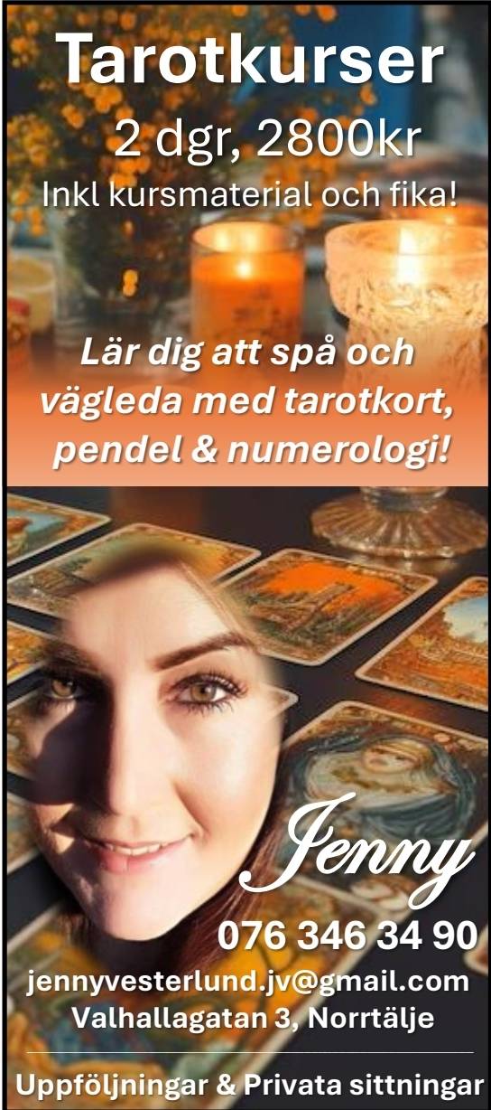 Lär dig att spå med hjälp av tarotkort, pendel och numerologi! Vi går igenom alla kort och läser av flera olika läggningar. Fika ingår! Lör-sön, 3-4 januari. 10-17 Eller Lör-sön, 24-25 januari.10-17 Vid frågor: 076-346 34 90 Jennyvesterlund.jv@gmail.com