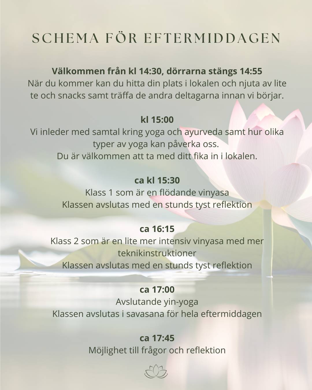 Välkommen till en workshop på temat att fördjupa din yogapraktik. En workshop för dig som är nyfiken på yoga men kanske inte hittat din grej eller för dig som har yogat ett tag men vill fördjupa dig och få ut ännu mer av yogan. I den här workshopen kommer vi inte att jobba med avancerade positioner och på så sätt fördjupa oss utan vi kommer att jobba med olika typer av yoga och även bjuda in ayurvedan i vår praktik. Du kommer att få prova på tre olika klasser med olika inriktning och det kommer finnas möjlighet till reflektion. Du behöver inte ha några förkunskaper alls till yogan, bara vara nyfiken.