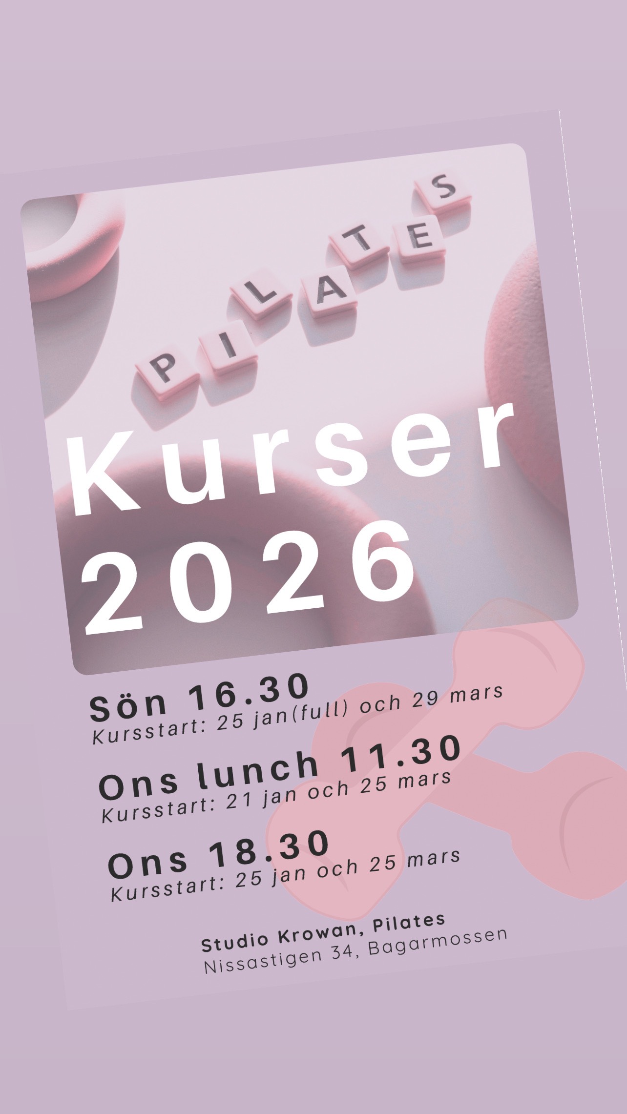 Välkommen på invigning och Öppet hus av vår Pilatesstudio i Bagarmossen, Nissastigen 34. Kom och prata Pilates, testa på ett pass, eller säg hej. Vi kommer att ha kortare Prova på-klasser under dagen 30 min. - 11.30-12.00 - 13.30-14.00 - 15.00-15.30 Anmälan gör du nedan (vid förhinder avanmälan du dig så att nästa i kl kan ta din plats). Varmt välkommen/ Studio Krowan