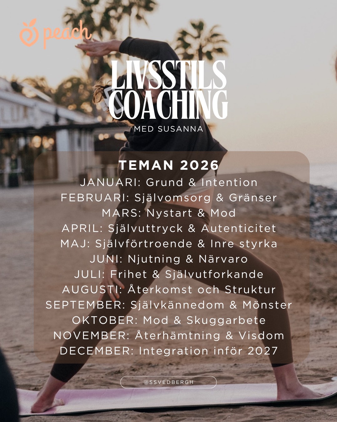 Vill du skapa mer struktur, självinsikt och hållbara vanor i din vardag – utan att pressa dig själv? Längtar du efter ett sammanhang där personlig utveckling får vara både mänsklig, strukturerad och hållbar – då är du varmt välkommen att vara med på mina coachingträffar varje måndag 🤍 Under 2026 håller jag veckomöten för personlig utveckling där vi jobbar med små, konkreta vanor och reflektioner som bygger förändring över tid. Fokus ligger både på det mentala och det praktiska – med utrymme för samtal, insikter och verkliga erfarenheter från vardagen. ✨ Varje månad har ett tydligt tema ✨ Varje vecka jobbar vi med 1 vana + 1 reflektion ✨ På mötena följer vi upp tillsammans, både vinster och utmaningar Kommande teman: 🌿 Februari – Självomsorg & gränser (v5-8) 🌱 Mars – Nystart & mod (v9-13) 🌸 April – Självuttryck & autenticitet (v14-17) BOKA PLATS Gratis prova på: boka en första kostnadsfri plats för att ta del av ett möte och känna in känslan Medlemskap: Investera i ett medlemskap för att kunna boka plats på mötet varje vecka under en och samma månad. Du går med via medlemskap i Peach-appen för 499 kr/månad – utan bindningstid (du kan säga upp när du vill). Vill du höra mer om upplägget, hur mötena går till och om det här passar dig? 👉 Se videon i inlägget. Hoppas du ska vilja vara med och utvecklas tillsammans under 2026! En vana, en reflektion, en vecka i taget ✨