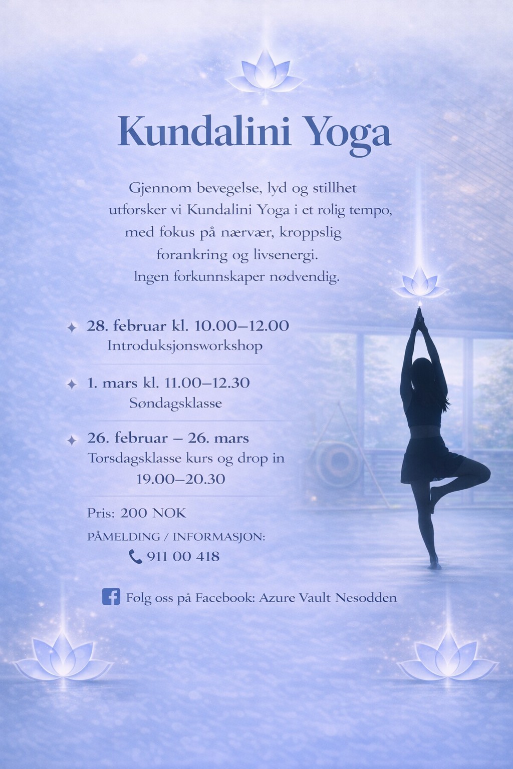 After a beautiful, sold-out introduction weekend to Kundalini Yoga at Azure Vault, I’m deeply grateful and very happy to share that I have scheduled more classes: Introduction Workshop Saturday 28th of February 10.00-12:00 For those who want a fresh entry into the practice or wish to revisit the foundations. Sunday Class Sunday 1st of March 11.00-12.30 A regular Kundalini Yoga class — open to both beginners and those with previous experience. Kundalini Yoga Course – Thursday Evenings Starting Thursday, 26th of February until 26th of March: 19:00-20.30 A 5-week evening course, offering continuity, depth, and space to let the practice settle and evolve over time. Prices: • Drop-in class: 200 NOK • Thursday course (5 weeks): 800 NOK (for those who have attended an introduction workshop), 1000 NOK otherwise • Introduction workshop + Thursday course: 1000 NOK (bundle price) To secure your spot, Vipps to 91100418 with your email and course of choice. All sessions are held at Azure Vault, Nesodden — a light-filled, calm space created for presence, exploration, and rest. We will do both a physical kriya, meditation, and a longer relaxation with the magic of the gong. Kundalini Yoga is a powerful yet gentle practice where breath, movement, sound, stillness, and attention work together to strengthen vitality, clarity, and connection to the body’s life energy. The practice invites listening rather than performance, and supports both grounding and expansion of the nervous system. ✨ Feel free to send a message if you’re curious, have questions, or feel the pull ✨