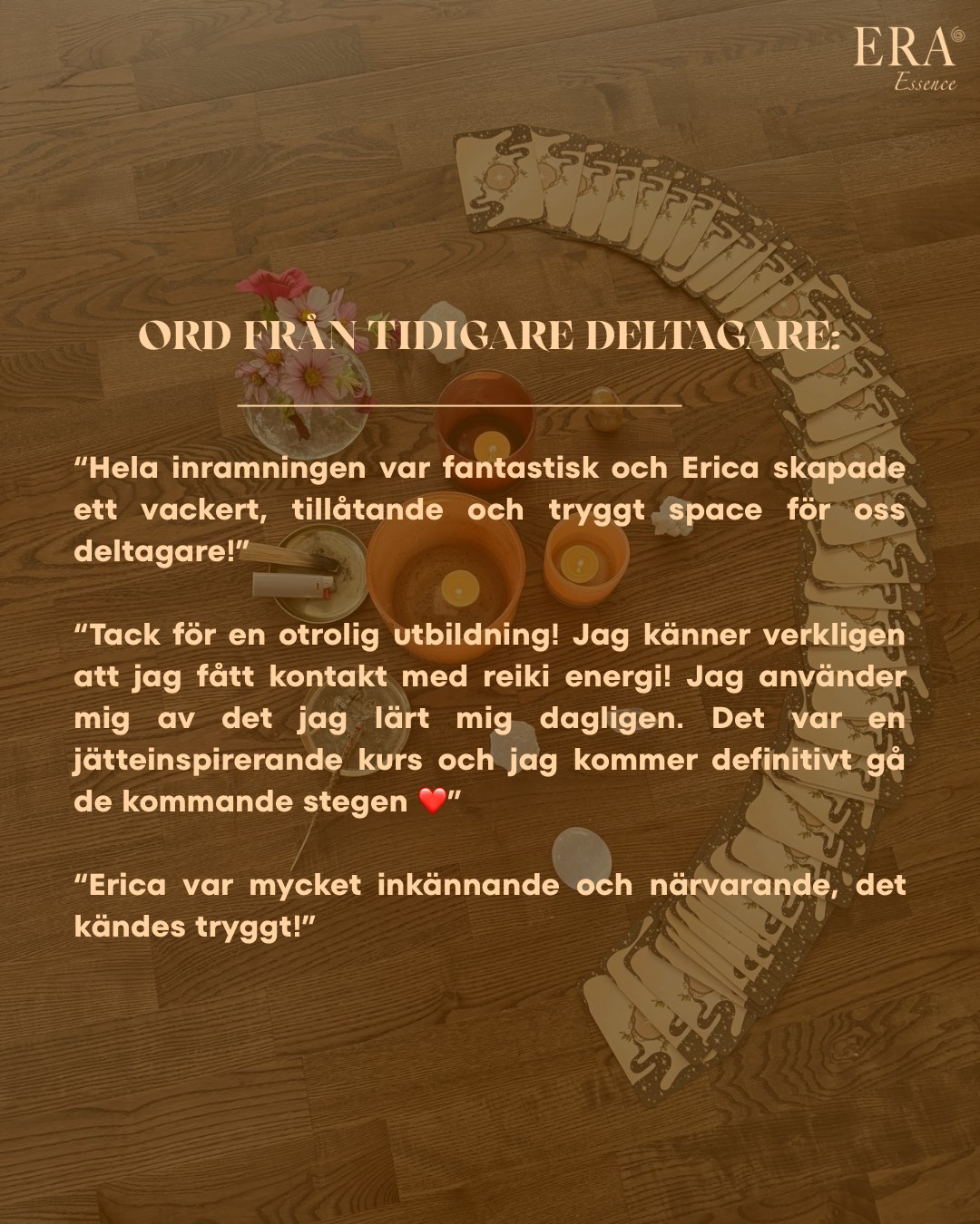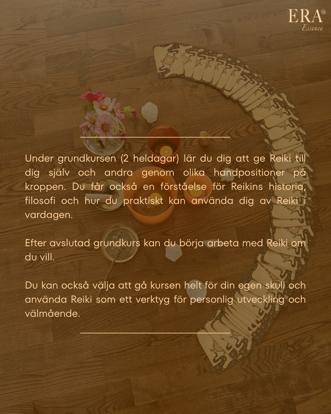 Anmälan sker till: info@eraessence.se Early bird-pris: 4.795 kr t.o.m. 1 mars 2026. Om du anmäler dig innan 1 februari får du en liten bonus. ____________________________________ Välkommen till Usui Reiki - Shoden (steg I) och utbildningshelg i Stockholm! 25-26 april kl. 09.30-16.30 båda dagarna. Under grundkursen lär du dig att ge Reiki till dig själv och andra genom olika handpositioner på kroppen. Du får också en förståelse för Reikins historia, filosofi och hur du praktiskt kan använda dig av Reiki i vardagen. Efter avslutad grundkurs kan du börja arbeta med Reiki om du vill. Du kan också välja att gå kursen helt för din egen skull och använda Reiki som ett verktyg för personlig utveckling och välmående. Kursmaterial, diplom, lunch & fika båda dagarna och en goodiebag ingår. Din anmälan är bindande men det går att överlåta din plats till någon annan om du skulle få förhinder. Begränsat antal platser! Kursinnehåll: • Vad är Reiki? • Reikins historia, filosofi och etik • Reiki-principerna • Initiering • Den första Reiki-symbolen • Gassho • Handpositioner • Hur en Reikibehandling går till • Praktisk övning • Chakrasystemet • Utrensningsprocessen • Etik och moral • Meditationer, cirklar, reflektioner, tid för frågor m.m. Känner du en nyfikenhet? ✨ Lita på att det är din intuition som talar till dig. Vi behöver inte alltid ha alla svar eller en plan framåt. Denna utbildning kan vara ett första steg mot något nytt — låt steget efter få överraska dig. Med värme, Erica Reiki Master