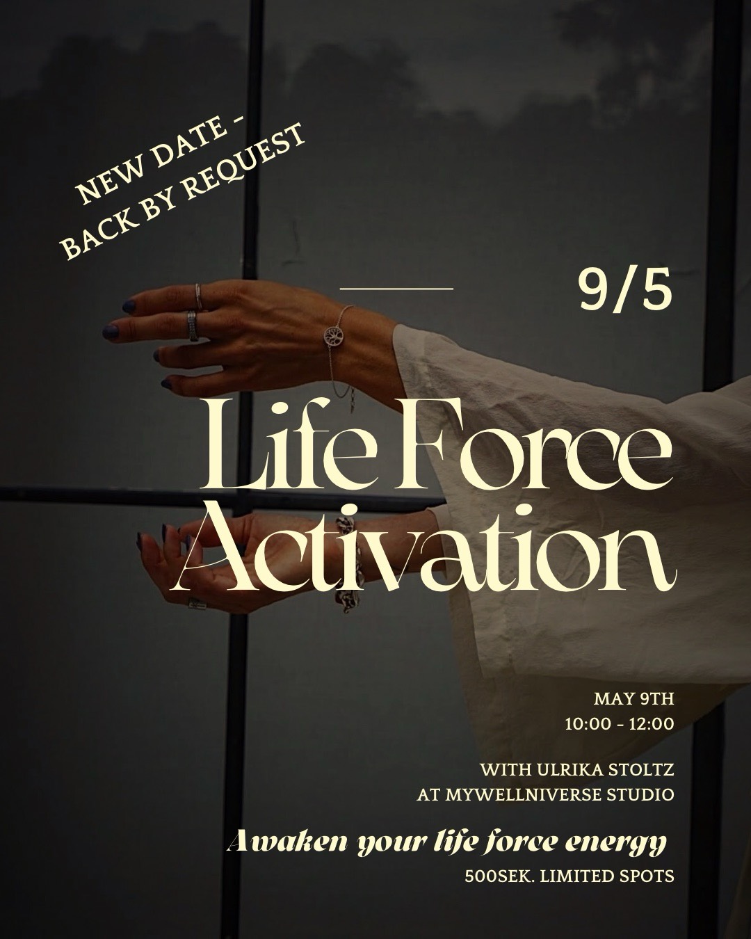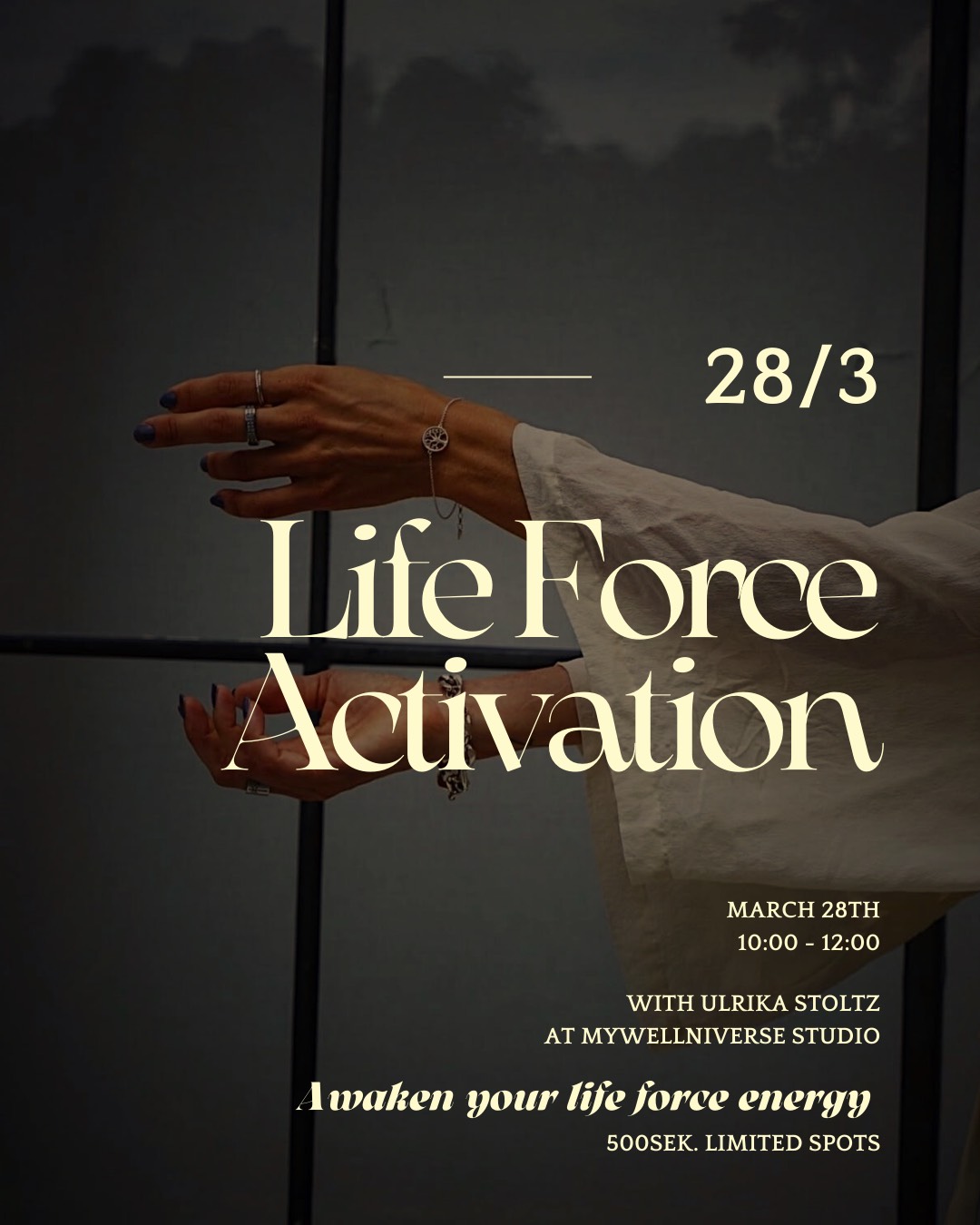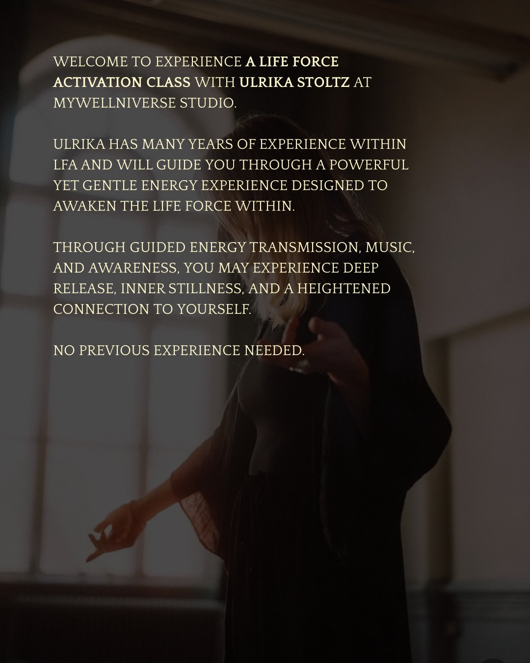 Welcome to a Life Force Activation class with Ulrika Stoltz at Mywellniverse Studio. Life Force Activation (LFA) is a powerful yet gentle energy experience designed to awaken the life force within. Through guided energy transmission, music, and awareness, participants may experience deep release, inner stillness, and a heightened connection to themselves. Ulrika has many years of experience working with Life Force Activation and will guide the session in a safe and supportive space. No previous experience is needed. The session begins with a short introduction at 10:00, followed by approximately 90 minutes on the mat. After class, you are warmly invited to stay for tea and take a moment to explore our Wellniverse.