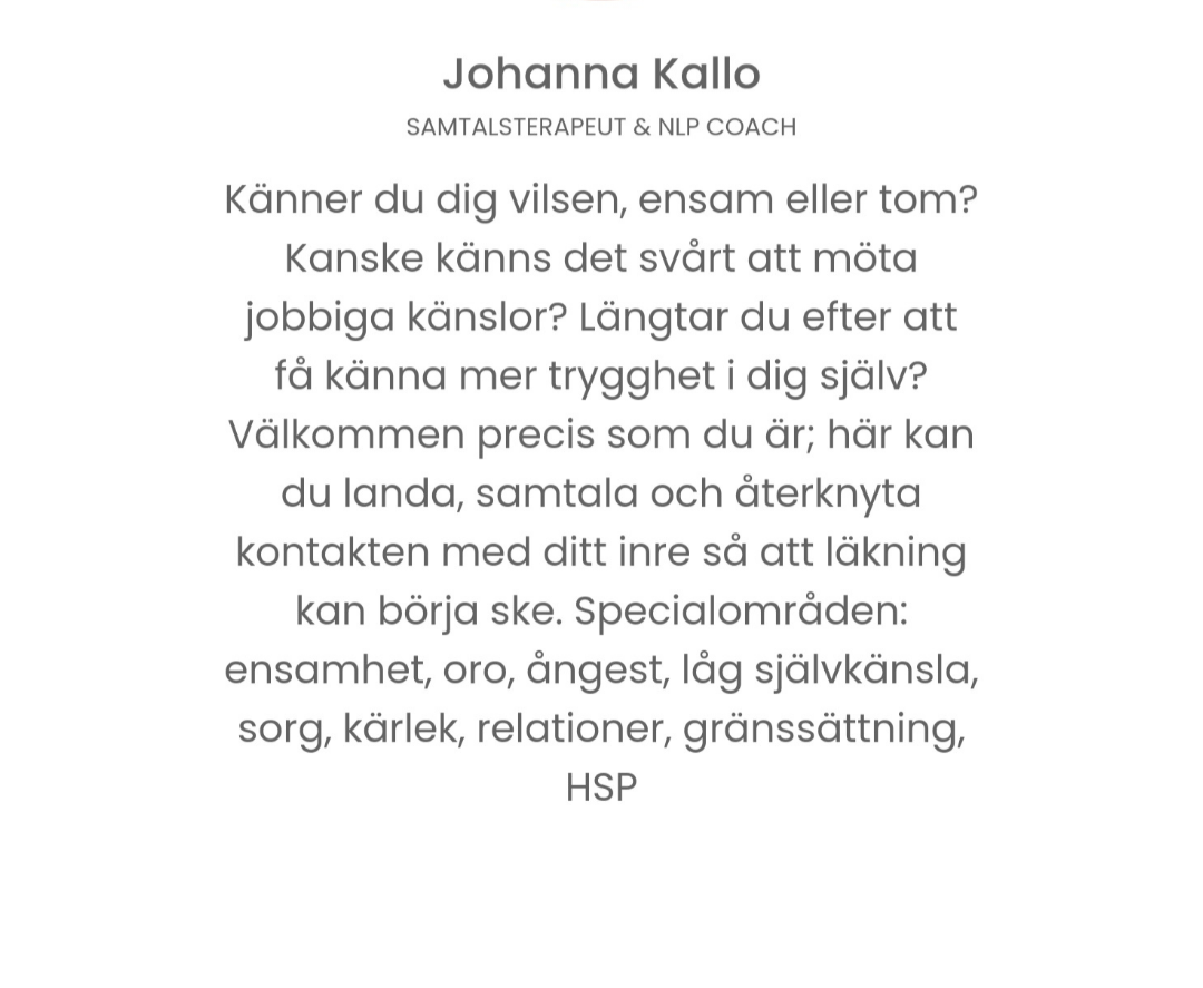 1:1 session på 60 eller 90 minuter fysiskt centralt i Stockholm eller online. Vi utforskar genom samtal och övningar det som har format dig så du kan få integrera hela dig, komma i djupare kontakt med den du är, det du längtar efter så att du kan skapa och leva det liv du drömmer om. Nyfiken på om det känns rätt för dig? Välkommen att höra av dig för ett kostnadsfritt lära känna samtal. Läs mer: https://livily.se/terapeut/johanna-kallo