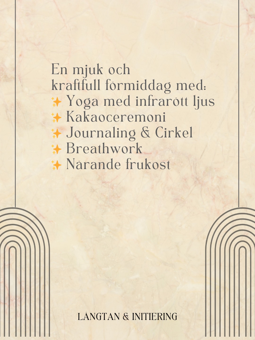 Efter månader av vinter och mörker börjar naturen sakta vakna till liv i mars. Ljuset återvänder, energin rör sig och precis som i naturen sker en förändring i våra kroppar. Våren markerar starten på en ny årscykel. Det är en tid för att väcka längtan, sätta intentioner och så frön för det som vill växa – i livet, i hjärtat och i själen. Spring Awakening - Längtan & Initiering är en vårritual där du får landa i kroppen, öppna hjärtat och lyssna in din inre röst tillsammans med andra kvinnor. Vad vi gör: Vi guidar dig genom en hållen process där kropp, andetag och gemenskap får samverka: • Yoga med infrarött ljus • Närande frukost • Kakaoceremoni & cirkel • Djupgående breathwork Varför denna ritual? • Väcka din längtan i synk med våren • Initiera det som vill växa • Skapa ett tryggt rum där kvinnor får mötas. Vår intention är att du ska lämna med : • En starkare kontakt med dig själv • Inspiration och klarare intentioner • Ett öppet hjärtan • Livskraft och energi i kroppen Vi som guidar dig genom dagen är Emma Hedö (Yogalärare & Breathwork-facilitator) och Josephine Norrsund (Yogalärare och Inre årstiderna-facilitator) Yogalärare, vänner och spaceholders med ett gemensamt kall: att skapa trygga rum där kvinnor kan mötas och vila i att bara vara, bli hållna och minnas sin inre kraft. Vi ser fram emot att träffa dig 💛