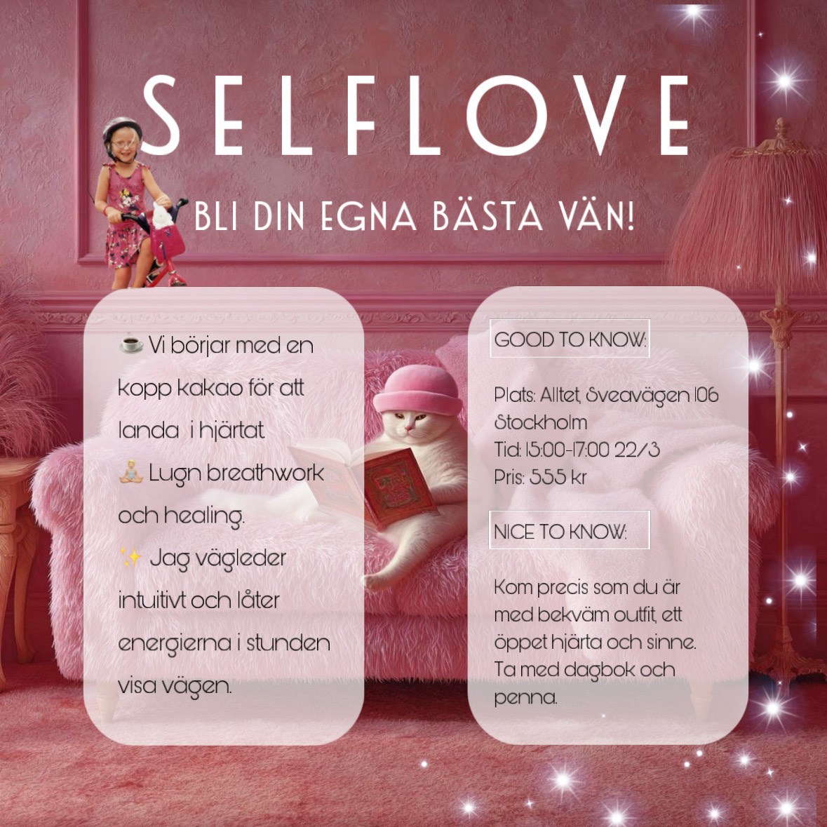 Välkommen till en SELF LOVE workshop 💖🧡💗 En eftermiddag för dig att landa, mjukna och möta dig själv med värme. Vi börjar i stillhet med en kopp kakao, låter andetaget guida oss hem i kroppen och öppnar upp för en stund av närvaro, reflektion och healing. Det här är en trygg och kravlös stund där du får vara precis som du är – inget ska presteras, inget ska fixas. Bara du, ditt hjärta och stunden som får visa vägen. 📍: Alltet, Sveavägen 106, Stockholm 🗓️: 22/3 ⏰: Kl. 15.00–17.00 💰: 555 kr Under workshopen kommer du få: ✨ Landa i hjärtat med en kopp kakao ✨ Guidad, lugn breathwork för att stilla sinne och kropp ✨ Mjuk healing och intuitiv guidning ✨ Tid för reflektion och kontakt med ditt inre ✨ Skriva och lyssna in – låta det som vill komma fram få ta plats Jag guidar intuitivt och låter energierna i stunden visa vägen, så varje tillfälle blir unikt och anpassat efter gruppen. För dig som: ✨ Längtar efter mer självkärlek och inre lugn ✨ Vill stanna upp och möta dig själv med vänlighet ✨ Behöver en mjuk paus från vardagens tempo ✨ Är nyfiken på breathwork, healing och intuitivt utforskande Bra att veta: ✨ Kom precis som du är – i bekväma kläder ✨ Ta med dagbok och penna ✨ Inget krav på tidigare erfarenhet ✨ Ett öppet hjärta och sinne räcker långt Det här är en stund för lilla du 🤍 Du är redan hel, darling – låt denna eftermiddag påminna dig om det.