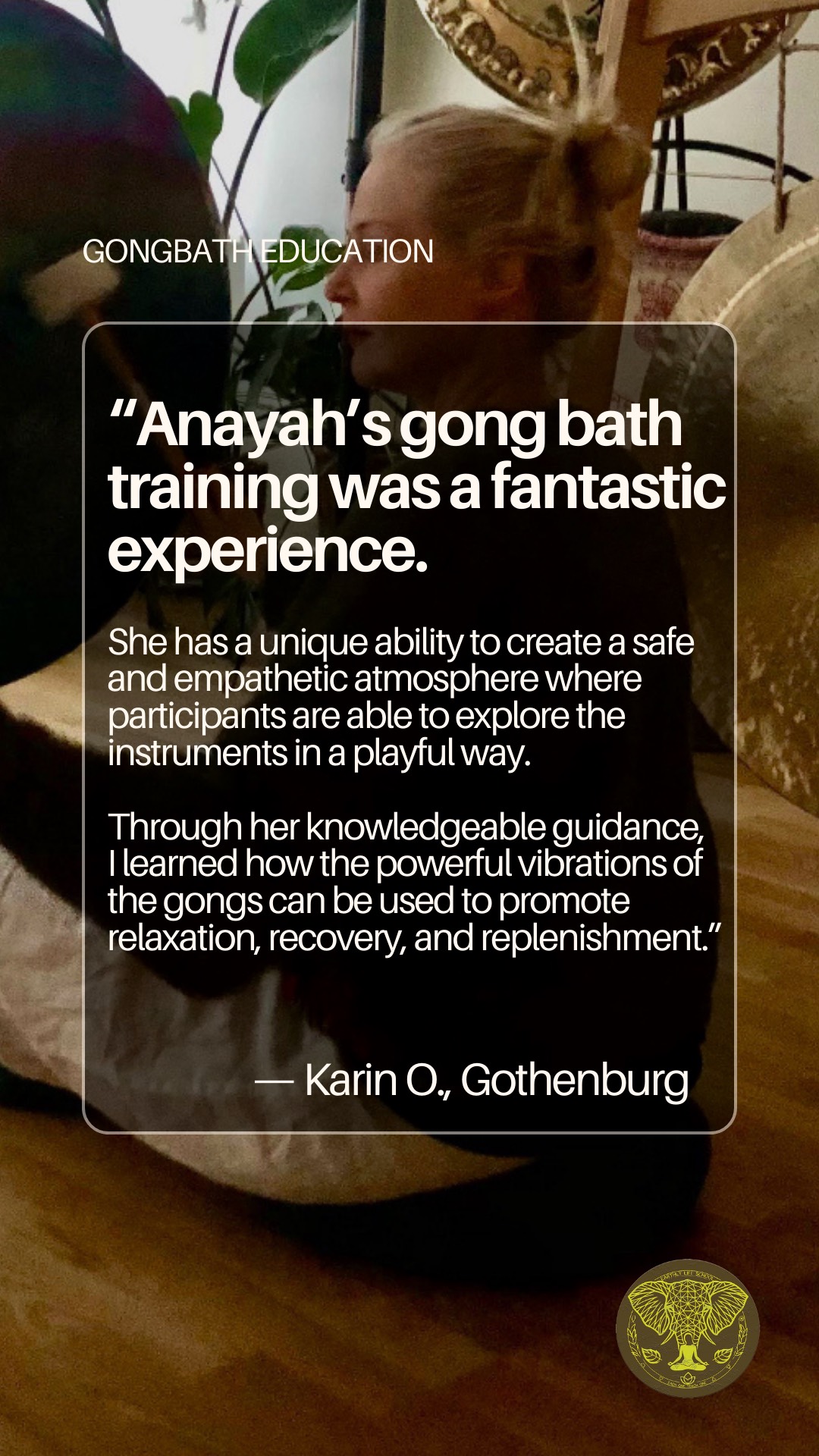 Certified Gong Bath Education – Level 1 With Anayah Roots This foundational training is for those who want to work with sound as a spiritual practice and learn how to facilitate Gong Bath sessions in a grounded, safe, and professional way. The education integrates sound healing with multiple instruments, with a strong focus on Gong Bath, presence, intention, and energetic awareness. You will learn the fundamentals of sound and vibration, how to create and hold a safe space, and how to guide both 1:1 sessions and group sessions with clarity and integrity. The training combines theory, practical exercises, and embodied learning, giving you the confidence to begin facilitating sound healing experiences. The education is held by Anayah Roots, certified Gong Bath facilitator and sound healing practitioner with over 5,000 hours of hands-on experience, facilitating sound healing and Gong Bath sessions up to 10 times per week. What you will learn: • Fundamentals of sound & vibration • Multi-instrument sound healing with a focus on Gong Bath • How to create and hold a safe, grounded space • Presence, intention & energetic awareness • How to facilitate 1:1 sessions and group sessions Practical information: • Duration: 16 hours (2 days) • Language: Swedish or English (depending on the group) • Limited to 4 participants per date • Booking via the Peach Fitness / Peacefulness app • Registration fee: 1,500 SEK (non-refundable) • All prices include 25% VAT This Level 1 training is the first step for those who wish to deepen their relationship with sound and begin guiding others through Gong Bath and sound healing practices. Booking Confirmation (English) – via Peach Fitness / Peacefulness App
