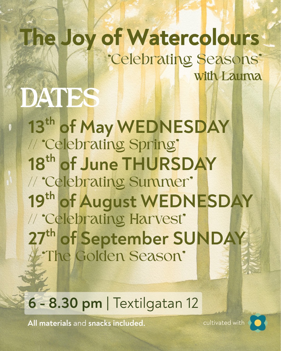 Experience the joy of watercolours together with artist Lauma. She invites you to celebrate seasons of life by painting everyday objects with watercolours and share her joy of bringing something to canvas. Throughout this series, you will explore a different theme at each workshop — each one a celebration of a season of life. ____________________ WHAT TO EXPECT ____________________ DURING THE WORKSHOP At the start of the workshop, Lauma will introduce herself and walk you through the basic techniques of watercolours. She will introduce the theme and offer suggestions on what to paint — and you are welcome to share the object you brought and the story behind it. From there, you will practice techniques step by step, sketch and paint your own piece. Lauma will walk you through every step so that it is easy for you to apply. She loves sharing her knowledge and insights about watercolours and various techniques, and will also share tips that she wishes she had known as a beginner, with the goal of making the entire experience smoother and more exciting. 🎨 The evening closes with a small exhibition — a circle where everyone shares their creation and reflects on what the theme means to them. ____________________ WHAT TO BRING ____________________ Nothing — all materials are provided. Just bring yourself (and optionally, a small object that connects to the theme of the evening). BEFORE THE WORKSHOP (Optional) You are invited to look around and find an object that connects to the theme of the evening and bring it with you. * Celebrating Spring — 13th of May On your way to the workshop, pick up a flower you find along the path. * Celebrating Summer — 18th of June Before you arrive, step outside and find something that feels like summer to you. * Celebrating Harvest — 19th of August On your way, pick up something from the earth that feels like it belongs to late summer and the turning of things. * The Golden Season — 27th of September Bring something golden. It might be a leaf caught mid-fall, a dried flower, a chestnut, a berry. ____________________ ABOUT LAUMA ____________________ Lauma is an artist and graphic designer based in Gothenburg, creating work that explores emotions and the connection between humans and nature. Feminine energy is a recurring theme in her art — calm yet powerful, a universal force present in everyone. Her goal is to invite people into that energy: creative, magnetic, intuitive, soft yet confident. She finds inspiration in nature and the small moments of everyday life, and in movement and music — both help her connect more deeply to feeling and the natural flow of life. “What excites me most about this event series is the chance to teach and show people how truly fun painting with watercolours can be. Painting flowers, in particular, is such a joyful experience. It gives us the opportunity to observe and capture the essence of blooms, creating a unique connection with nature. In that moment, you capture the feeling and it stays with you forever.” 🗣️ The workshop is held in English. Swedish instructions are available too. 🎨 ALL MATERIALS INCLUDED. Just come and paint. 🍵 Light refreshments and snacks are included — as well as non-alcoholic drinks. 🌱Lauma is cultivating her creation in collaboration with Colours of Being. Want to cultivate too? 🔗thecoloursofbeing.com/cultivate