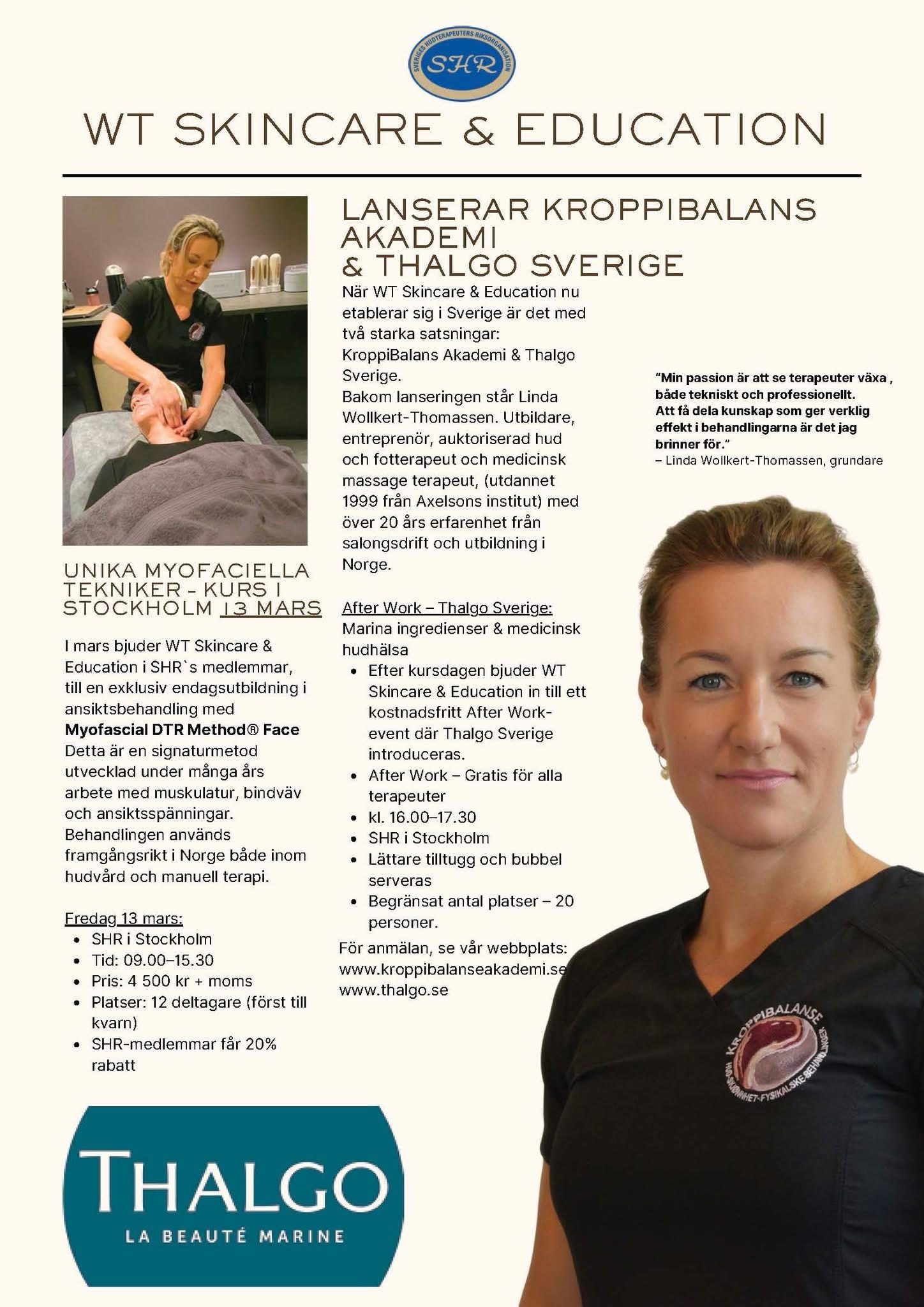 ✨ KURS + AFTER WORK I SHR LOKALER – STOCKHOLM ✨ Myofascial DTR Method® – Patenterad Ansiktsmassage 13 mars 2026 SHR, Stockholm Är du hudterapeut, massageterapeut, osteopat eller fysioterapeut och vill arbeta med en avancerad, resultatinriktad metod som ger synliga resultat redan efter första behandlingen? Välkommen till en exklusiv 1-dagars workshop i min patenterade metod: Myofascial DTR Method® — utvecklad för att behandla både hud och underliggande muskulatur på djupet. Metoden kombinerar: • Deep Tissue Release • Myofascial stretching • Neuromuskulära tekniker • Integrering med professionell hudvård Du lär dig att: ✔ Lyft och skulptera ansiktet naturligt utan apparatur ✔ Frigöra spänningar i käke, nacke och ansikte ✔ Förbättra mikrocirkulation, hudkvalitet och lyster ✔ Behandla käkproblematik, huvudvärk och spänningsrelaterade besvär ✔ Integrera tekniken i dina befintliga behandlingar och skapa en premium-tjänst Detta är en efterfrågad signaturbehandling som ger både terapeutiska och estetiska resultat. Pris Kurs + After Work: 4 500 kr + moms ✨ EARLY BIRD – EXKLUSIVT FÖR SHR-MEDLEMMAR 20 % rabatt vid anmälan senast 28 februari 🥂 EXKLUSIV AFTER WORK FÖR BRANSCHEN Efter kursen bjuder vi in till en inspirerande After Work i SHR:s lokaler. En möjlighet att: • Nätverka med kollegor • Uppleva marina premiumprodukter från Thalgo • Ta del av nyheter inom professionell hudvård • Inspireras, utbyta erfarenheter och skapa nya möjligheter Vi bjuder på bubbel, inspiration och en exklusiv inblick i framtidens behandlingstekniker. Kort Peach-versjon (perfekt for event app) Myofascial DTR Method® – Patenterad ansiktsmassage En exklusiv workshop där du lär dig min patenterade metod för att lyfta, behandla och förbättra ansiktet på djupet. ✔ Synliga resultat direkt ✔ Premium behandlingsteknik ✔ Certifiering Avslutas med exklusiv After Work och branschmingel. Begränsade platser. Bokning sker via vår hemsida: www.kroppibalanseakademi.se Klicka här för att säkra din plats. https://www.kroppibalansakademi.se/event-details/myofascial-dtr-massage-method-r-ansiktsmassage-kurs-after-work-thalgo-1