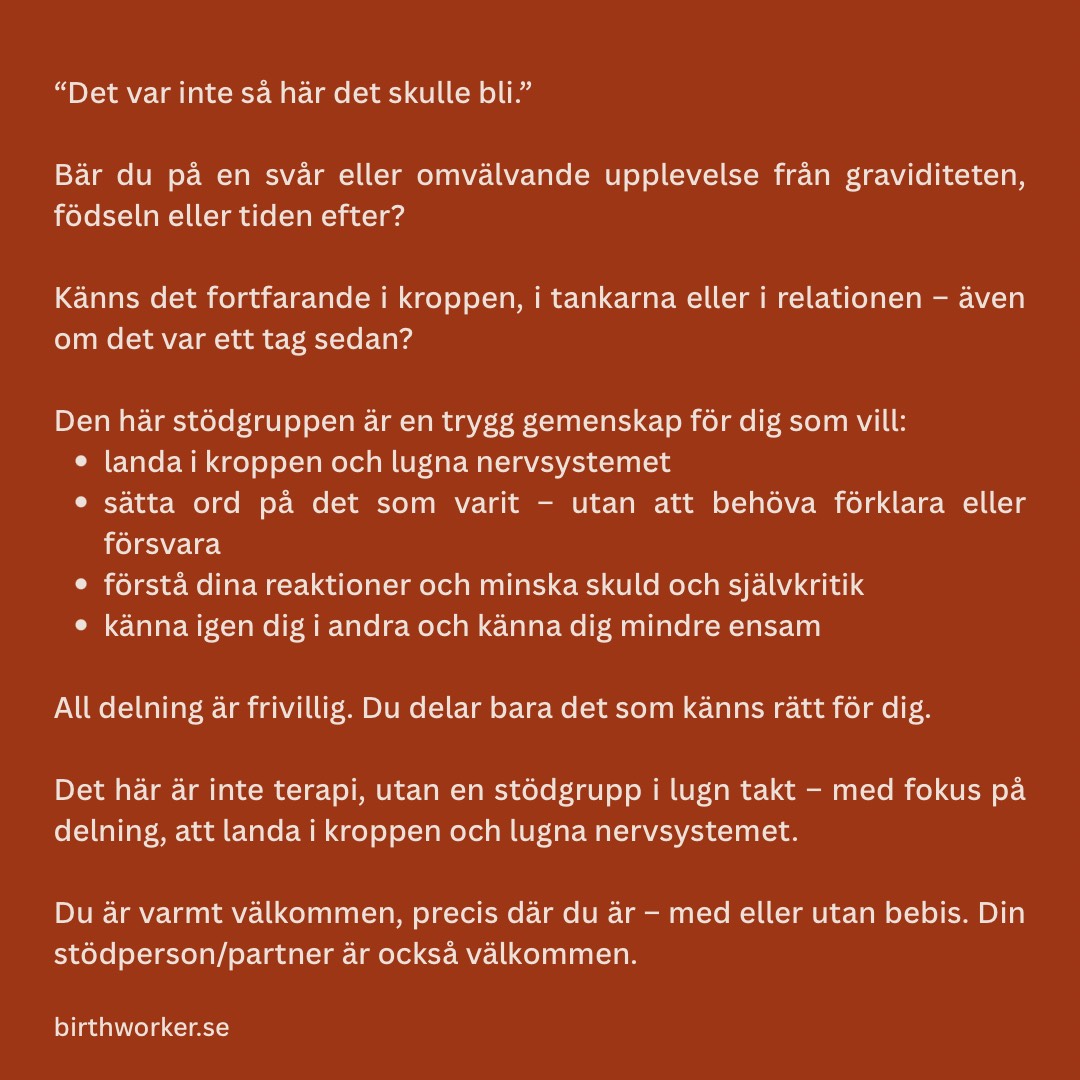 Stödgrupp online – efter en svår upplevelse kring graviditet, födsel eller postpartum En trygg gemenskap för dig som bär på en svår eller omvälvande upplevelse från graviditet, födsel eller tiden efter. “Det var inte så här det skulle bli.” Bär du på något som fortfarande gör sig påmint? Känns det i kroppen, i tankarna eller i relationen – även om det var ett tag sedan? Den här stödgruppen är för dig som vill: • landa i kroppen och lugna nervsystemet • sätta ord på det som varit – utan att behöva förklara eller försvara • förstå dina reaktioner och minska skuld och självkritik • känna igen dig i andra och känna dig mindre ensam All delning är frivillig. Du delar bara det som känns rätt för dig. Det här är inte terapi, utan en stödgrupp i lugn takt – med fokus på delning, att landa i kroppen och lugna nervsystemet. Du är varmt välkommen, precis där du är – med eller utan bebis. Din stödperson/partner är också välkommen. Gruppen hålls online. Länk skickas ut en vecka innan. Pris: 350 kr per hushåll Varmt välkommen! 🧡