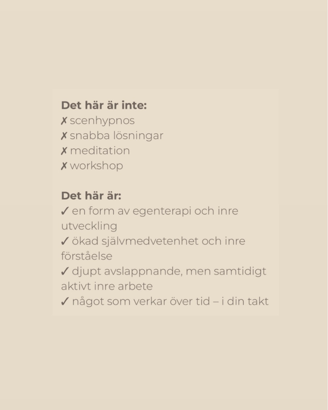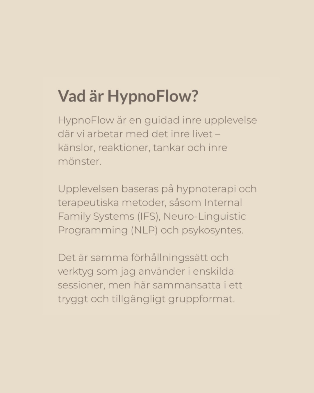 đ§đœââïž Inre Teambuilding En klass för dig som vill bli fri frĂ„n det som skaver och fĂ„ mer av det du lĂ€ngtar efter. HĂ€r fĂ„r du möta de delar inom dig som ibland drar Ă„t olika hĂ„ll â och skapa inre samarbete, lugn och sjĂ€lvtillit. Resultatet blir en tydligare inre riktning och mer balans i vardagen. âšâš âšâš âšâš âšâš Det hĂ€r Ă€r inte en vanlig wellnessklass. HypnoFlow Ă€r en guidad inre upplevelse som bygger pĂ„ en unik kombination av hypnos, delarbete och djupgĂ„ende sjĂ€lvutforskning â inspirerad av psykosyntes, IFS och NLP. SĂ„ hĂ€r gĂ„r det till Under klassen guidas du in i ett lugnt, meditativt tillstĂ„nd med hjĂ€lp av avslappning och inre visualiseringar. Klassen sker liggande med slutna ögon i en liten grupp och trygg miljö â allt du behöver göra Ă€r att följa med. Du behöver ingen tidigare erfarenhet, bara nyfikenhet och en vilja att möta dig sjĂ€lv pĂ„ ett mjukt och tryggt sĂ€tt. đ Plats: Kindstugatan 1, Gamla stan â° Datum & tid: 24 januari kl. 11:00 đ Pris: 495 kr đ BegrĂ€nsat antal platser đ« Sagt av tidigare deltagare: âMatchade höga förvĂ€ntningar! Din röst Ă€r sĂ„ behaglig och det mĂ€rks att du vet vad du gör. En vĂ€ldigt bra metod för att blicka inĂ„t och fĂ„ rĂ€tsida pĂ„ obehag som kan vara svĂ„rt att sĂ€tta fingret pĂ„ annars.â âWow! Vilken upplevelse. Jag har gjort det hĂ€r förut, men denna gĂ„ng var det som att jag kom tillbaka som en annan person â starkare, modigare, djupare. Tack! Precis vad jag behövde pĂ„ min resa.â âJag gick dĂ€rifrĂ„n med en kĂ€nsla av inre lugn, vilket var en stor kontrast mot hur jag kĂ€nde mig innan. AtmosfĂ€ren var trygg och rofylld, musiken förstĂ€rkte upplevelsen och Carolines trygga röst gjorde guidningen vĂ€ldigt behaglig!â âOtrolig upplevelse för mig som annars alltid Ă€r stressad och helt inkapabel till att ta det lugnt.â đ LĂ€s mer om HypnoFlow: Syntes-Samtal.se