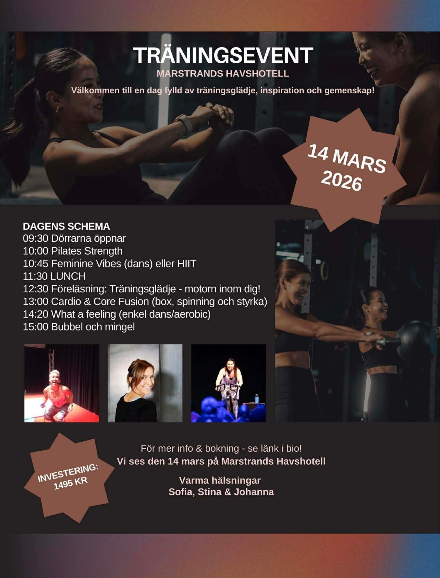 Träningscommunity i Kungälv som drivs av Sofia Persson utbildad träningscoach och som arbetat med träning i över 35 år. Jag coachar grupper för alla åldrar i tex . - Uteträning - inomhuspass som styrka, kondition, cirkelträning, pilates, rörlighet ,boxning, dans mm - Seniorträning i olika former - Barnvagnsträning Vilka pass som erbjuds beror på efterfrågan och säsong. Alla pass sker i gympasal eller utomhus. Ibland kan alltså passen vara i olika salar. Se plats på respektive aktivitet . Jag kör även träningsresor utomlands. följ alla aktiviteter/event och kurs-släpp löpande på: Facebook sluten grupp: https://www.facebook.com/share/g/14WhxTMWV7B/?mibextid=wwXIfr Instagram : https://www.instagram.com/jagtranarmedsofia?igsh=MWI1bGQ5eWR3YnRvaw%3D%3D&utm_source=qr